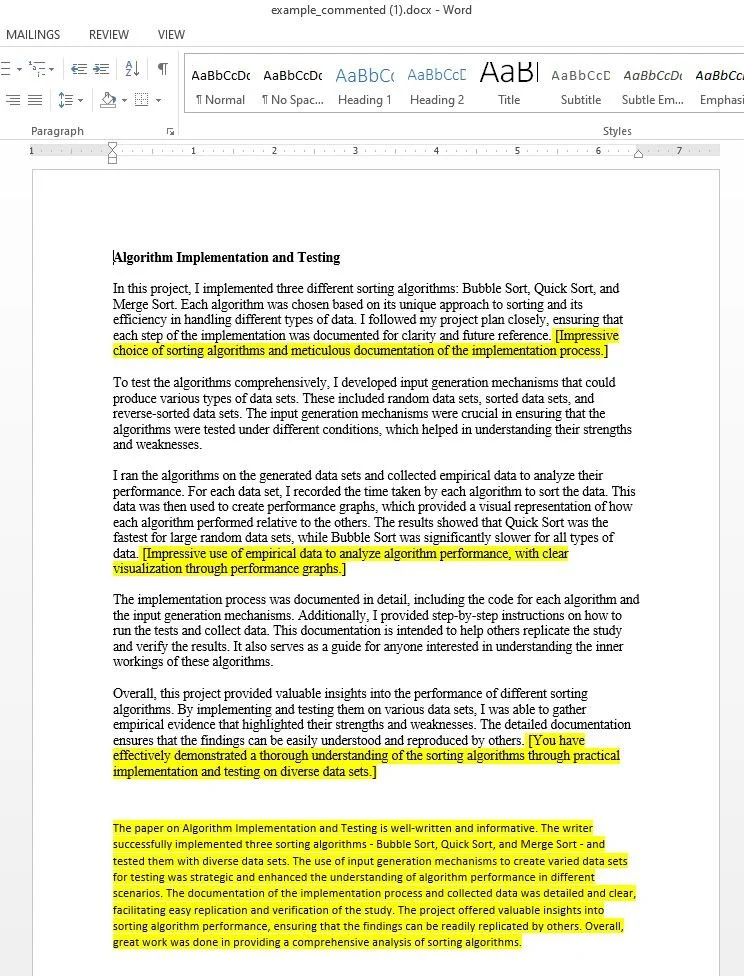 Upload documents and have each paragraph evaluated leaving in paper comments for the student, while providing an overall evaluation of the submission for your review. (Full native Word integration coming soon)